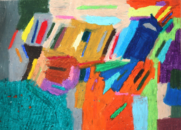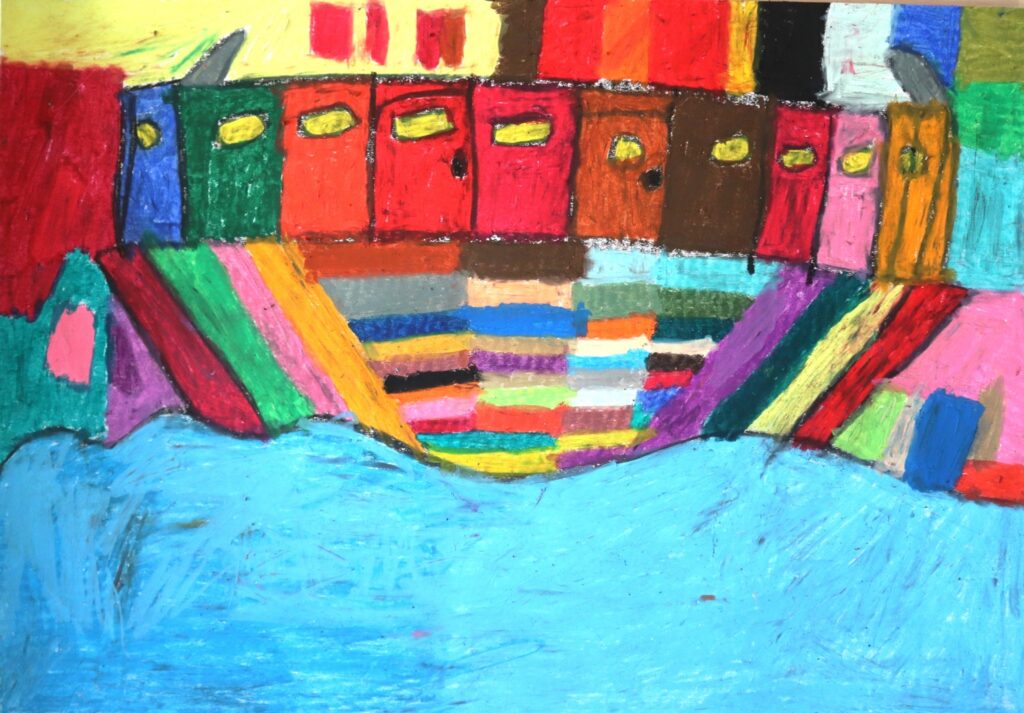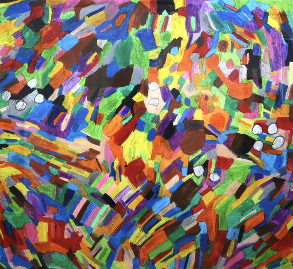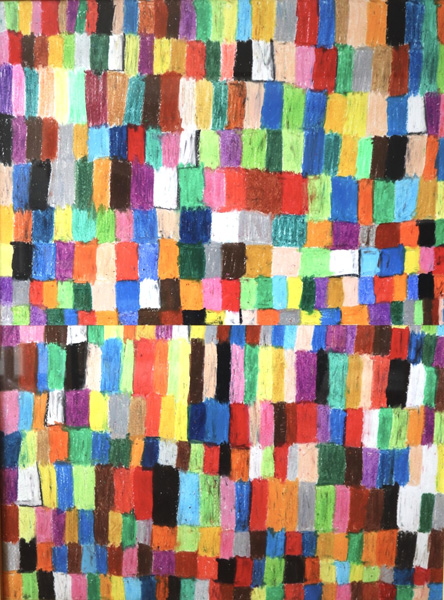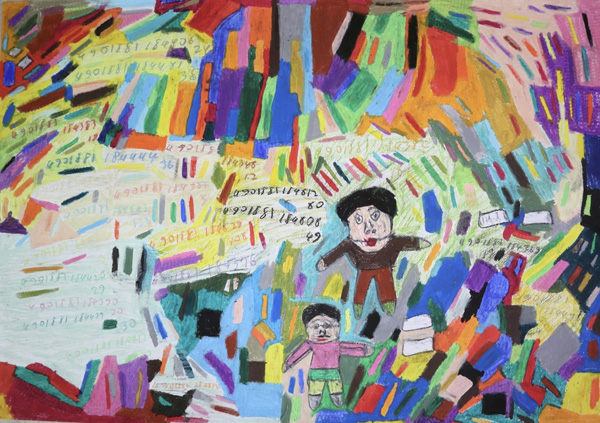 画用紙とクレヨンを使い、画面いっぱいに色を広げながら制作を行っている。色は一つひとつ並び合い、明るく、いきいきとした画面をつくり出す。人物やボール、牛、船、飛行機などのモチーフは、作者ならではの感覚で描かれている。制作の前には軍手を身に着け、目を閉じて静かに思考を巡らせる。その時間を経て、一枚一枚の画用紙と丁寧に向き合いながら、絵が生まれていく。